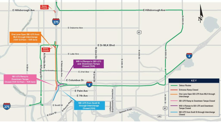 • Cierre total de I-275 norte e I-4 oeste: Desde las 5 a.m. hasta las 10 p.m. del sábado 4 de octubre, estos carriles estarán completamente cerrados en el intercambio hasta el lunes 6 de octubre a las 5:00 a.m.