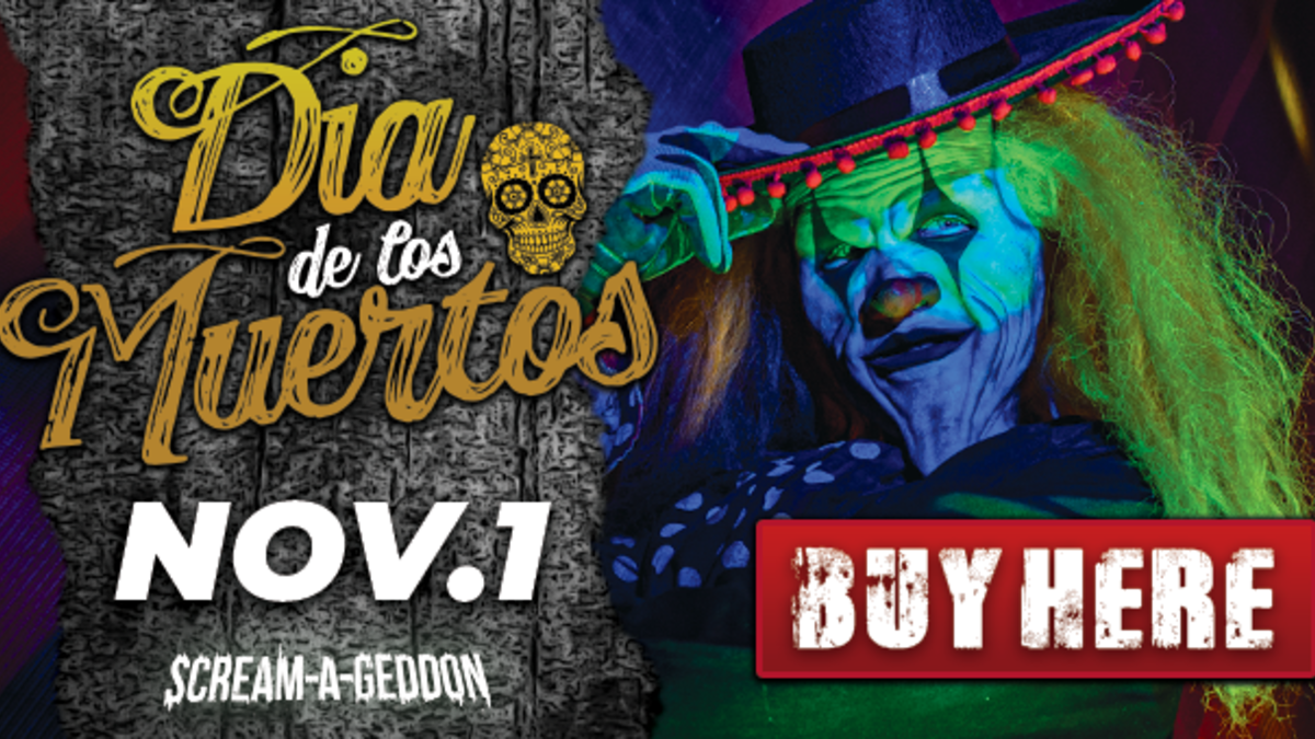 Ven y celebra con nosotros el día de los muertos! Scream-A-Geddon, la atracción temática de Halloween más horrorizante regresa por quinto año consecutivo con 6 atracciones – “Rage Three-D, Demon’s Revenge, Blackpool Prison, Deadwoods, Infected Ground Zero y el Zombie Paintball Assault”.